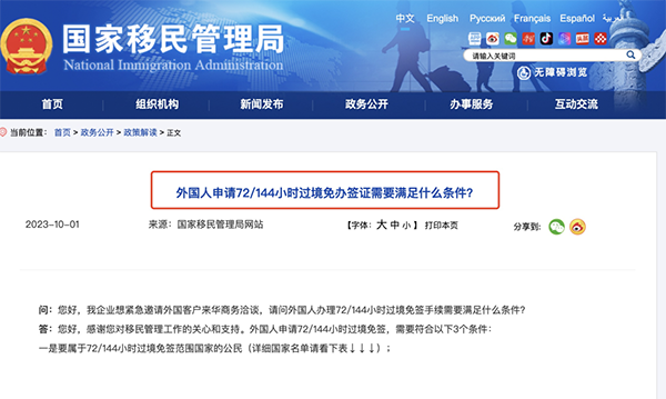 根据移民局官网信息,外国人申请72/144小时过境免签,需要符合以下3个条件: