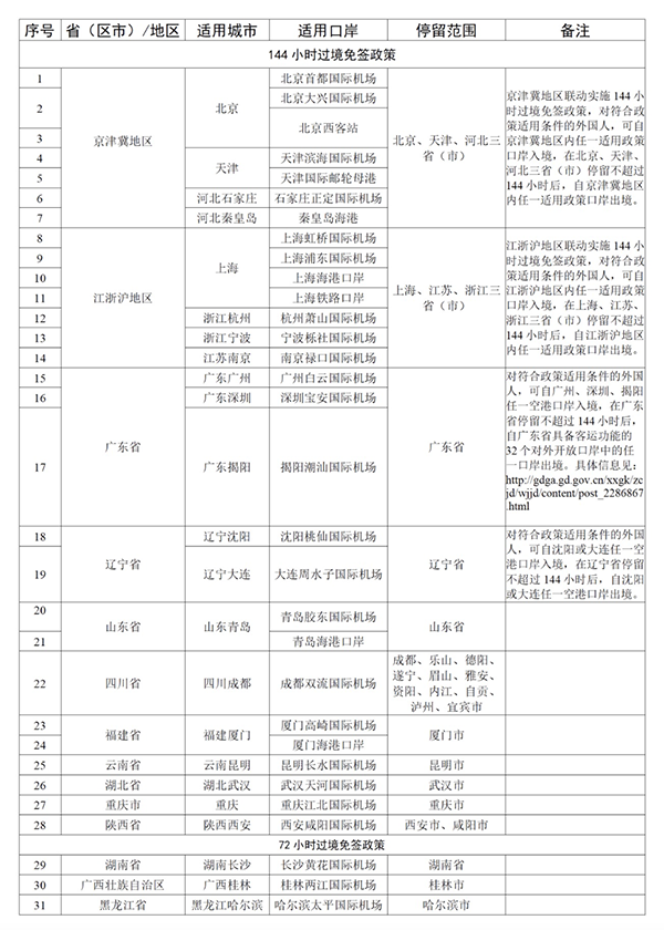 如外国人符合上述条件,可向我国20个城市的边检机关提出办理144小时过境免签申请,或向3个城市的边检机关提出办理72小时过境免签申请,其他城市暂未实施该项政策。